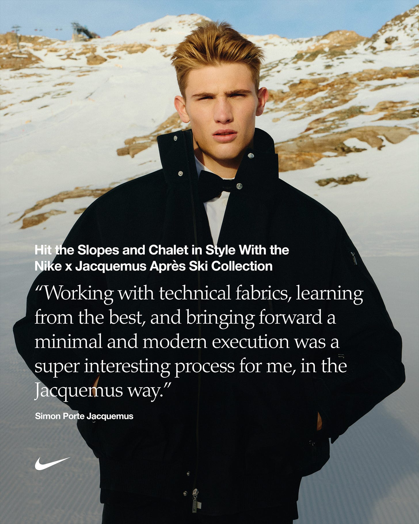 Add another name to the list of luxury brands going all-in on skiwear: Jacquemus just launched an 18-piece après ski collection with Nike. It’s built around the same thing that’s suddenly non-negotiable for fashion brands touching the slopes – technical credibility.